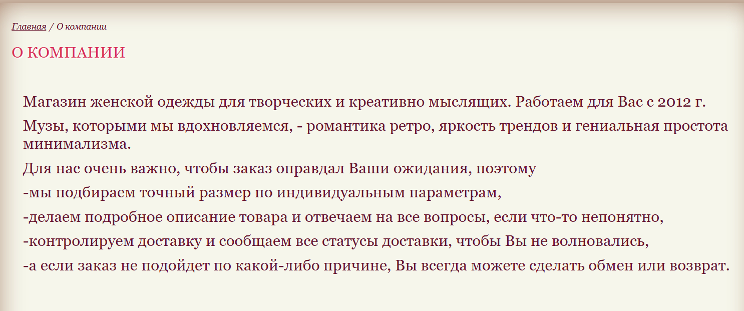 На сайте нет никакой юридически значимой информации: реквизитов юр. лица, договора оферты, политики конфиденциальности и т.п. На странице О компании размещен маркетинговый блок текста, который не содержит конкретных цифр, адресов, имен и брендов.