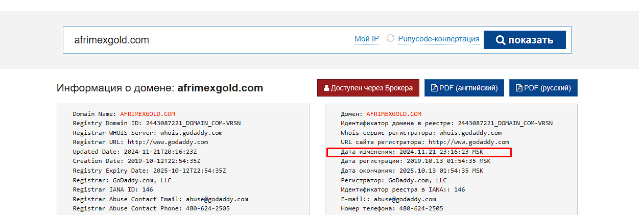 Команда разработчиков афримекс, заявляют об опыте работы в более чем 5 лет. Однако при проверке домена становится известно, что хоть сайт afrimexgold com был зарегистрирован в 2019 году, его выкупили в декабре 2024, что говорит о потенциальном мошенничестве.