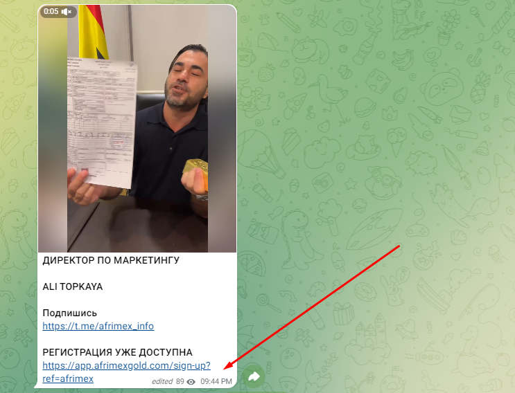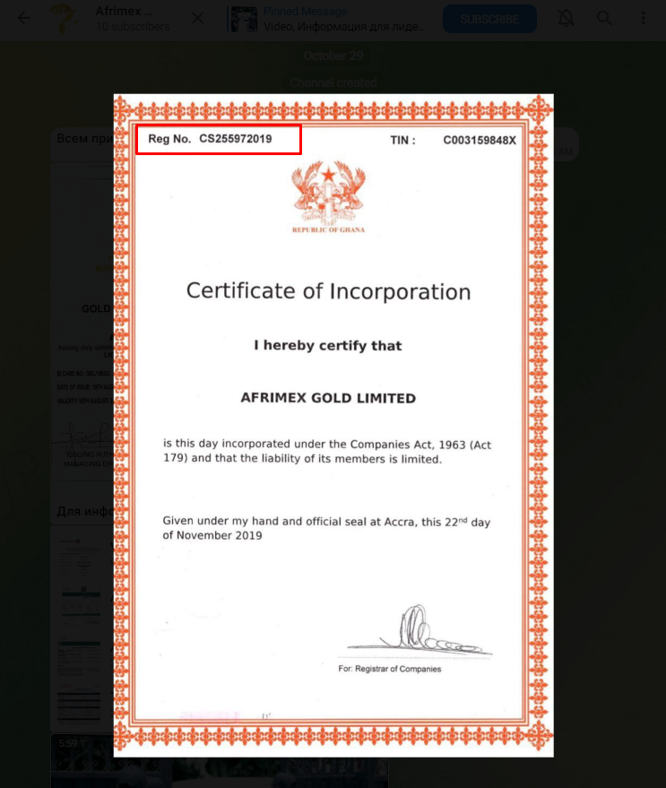 В качестве первого поста в тгк канале Afrimex Gold Info можно заметить документы на регистрацию проекта в Гане, которые не имеют никакого юридического подтверждения. Мы проверили официальную информацию на государственном портале государства и выяснили, что такая фирма не зарегистрирована.
