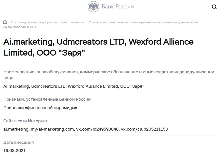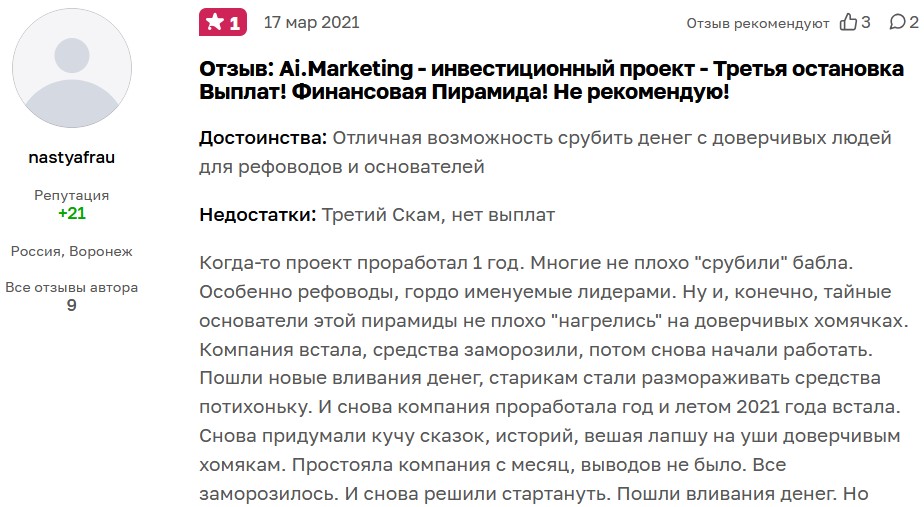 Проект AI Marketing не имел отношения к заработкам, маркетингу и торговым сетям, имел типичные для скама минусы:
