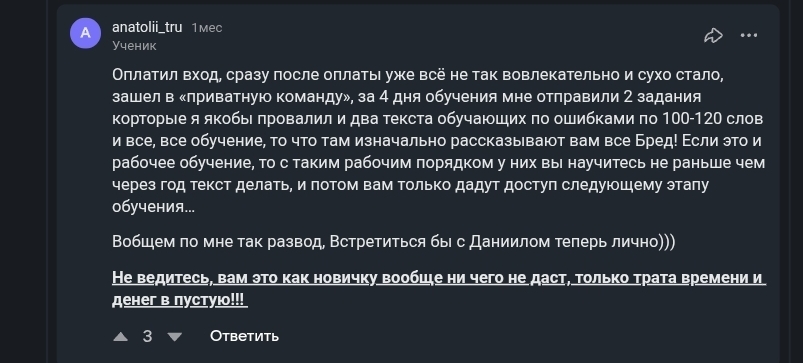AI Удаленка 1 по KZ отзывы в сети собирает негативные, а люди жалуются на развод. После покупки доступа к приватному каналу, активность от технической поддержки резко падает, все процессы текут вяло, а ученикам просто отправляют домашние задания на переработку без объяснения причин. Также отмечают низкий темп обучения, где на реальный доход можно выйти не раньше чем через 1 год, пустую трату времени и денежных средств.
