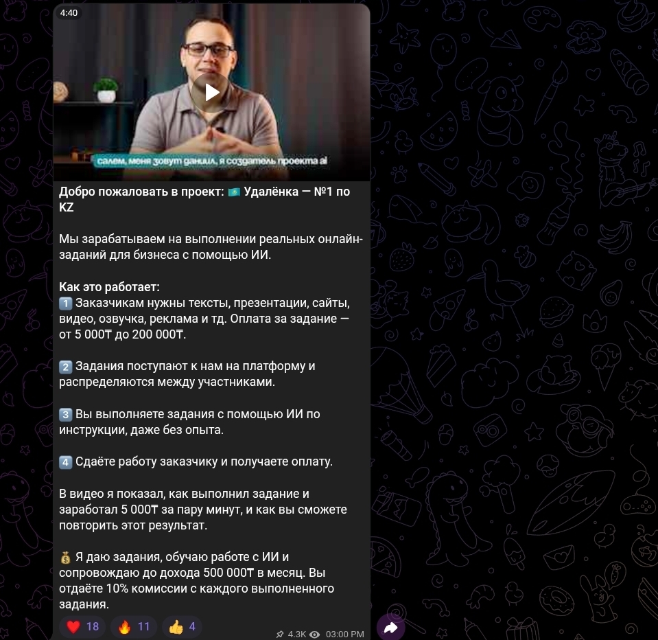 AI удаленка 1 по kz предлагает следующую цепочку: задание — видеоурок — выполнение — процент. На первый взгляд это выглядит как фриланс с менторством. Однако ни одна из ключевых переменных не раскрыта публично. Кто является заказчиком заданий? Это реальные внешние клиенты, которые платят за работу, — или задания генерируются внутри самого проекта? Каков фактический размер процента от выполненного задания? Есть ли минимальный порог вывода? Что происходит, если задание не принято заказчиком?