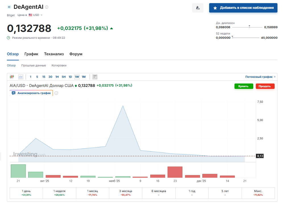 De Agent Ai – криптовалюта, которая давно прошла листинг на крупных международных биржах. Проект провел миграцию смарт-контракта на платформе Binance Alpha 2.0. После этого торговля токеном возобновилась. В результате стоимость «АИА» всего за сутки выросла на 117%. Такое обновление и рост подтверждают высокий уровень доверия к экосистеме. Приобрести токен можно на многих популярных биржах, правда, доступна пока только спотовая торговля, от маржинальной и фьючерсной биржи отказались. Поначалу это вызвало падение цены на актив, но затем стоимость снова увеличилась.В настоящий момент на Deagentai курс равен 0,129951 доллара. Пока что токен демонстрирует стабильный рост, так что монета является привлекательной для инвесторов. Взлетит ли AIA криптовалюта в дальнейшем еще, пока что сказать сложно, но в целом актив можно считать перспективным.