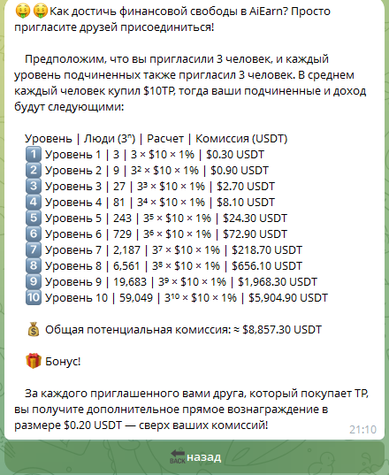 Стоит отметить еще один тревожный пункт, который связан с тем, что пользователям обещают заработок до 500 долларов за счет рефералки, а также целых 10 уровней вознаграждений за приглашенных пользовтаелей.