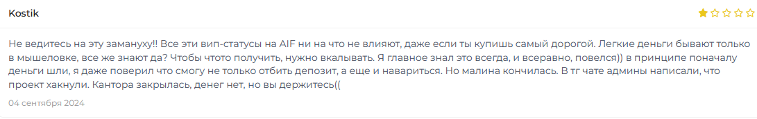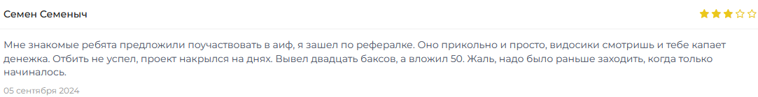 В сети можно найти отзывы о aifmovie com, большинство из них отрицательные. Некоторые пользователи говорят о том, что заработать небольшие суммы они успели, но вывести деньги не смогли, так как сайт Айфлай прекратил работу. Это означает, что пропали не только накопления, но и первоначально внесенная на депозит сумма.
