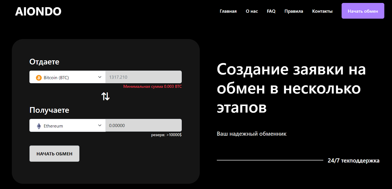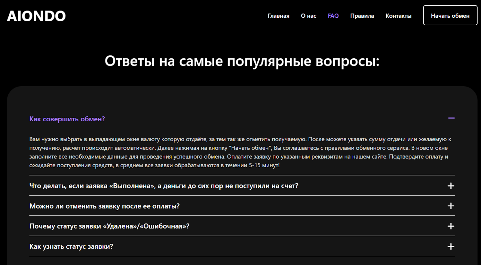 «Аиондо ком» подчеркивает, что обслуживание качественное и быстрое. Но первое, на что надо обратить внимание – формулировки. Например, «один из самых удобных и надежных обменных сервисов в мире». Прилагательные в превосходной форме и утверждения, что их сервис лучший в мире, часто используют мошенники. Они не способны опираться на реальные цифры и факты, поэтому делают громкие заявления. Это манипуляция, основанная на том, чтобы вызвать у клиента определенные эмоции и ожидания.