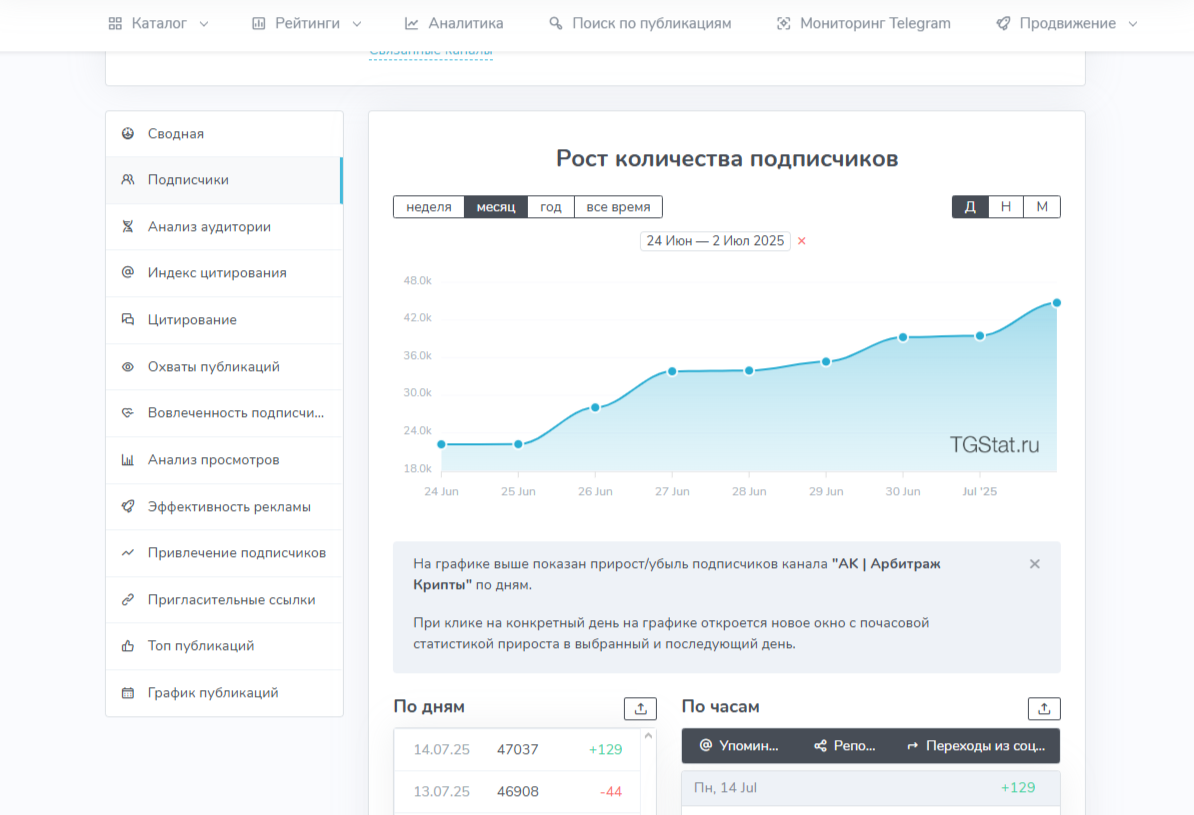 Проект появился в сентябре 2024 года. На июль 2025 года в там находится почти 47 000 подписчиков, а средняя заинтересованность — около 6 000 просмотров на публикацию. Правда, есть нюанс: согласно TgStat, в период с 24 июня по 2 июля на «AK Арбитраж Крипты» подписалось более 20 000 человек. Такая активность пользователей может быть связана с использованием накрутки подписчиков, либо с весьма эффективной рекламой.