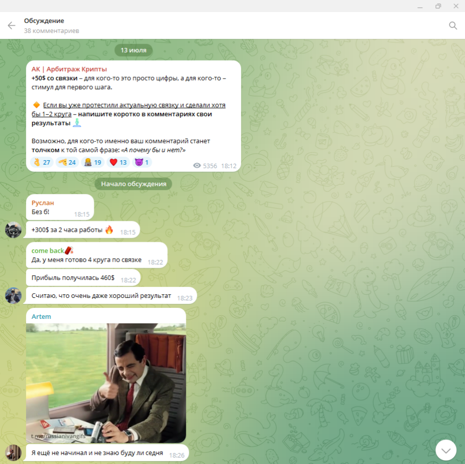 В канале регулярно публикуют сообщения от подписчиков с отчетами о доходах. Люди часто делятся тем, сколько удалось заработать за круг, а атмосфера обычно поддерживающая и позитивная. Среди отзывов в телеграмм-канале «AK Арбитраж Крипты» много благодарностей и историй о том, как получилось быстро выйти на прибыль.