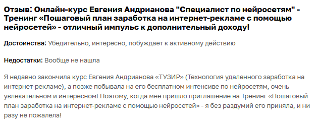 Отзывы о курсе Тузир х Нейросети от ИП Андрианов Евгений Владимирович странные. Вот так выглядит страница основного продукта.