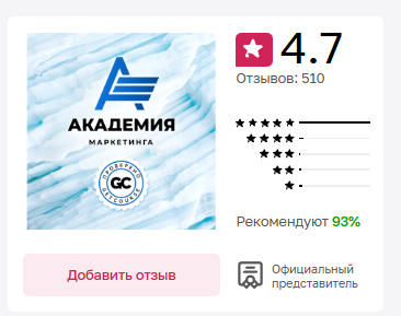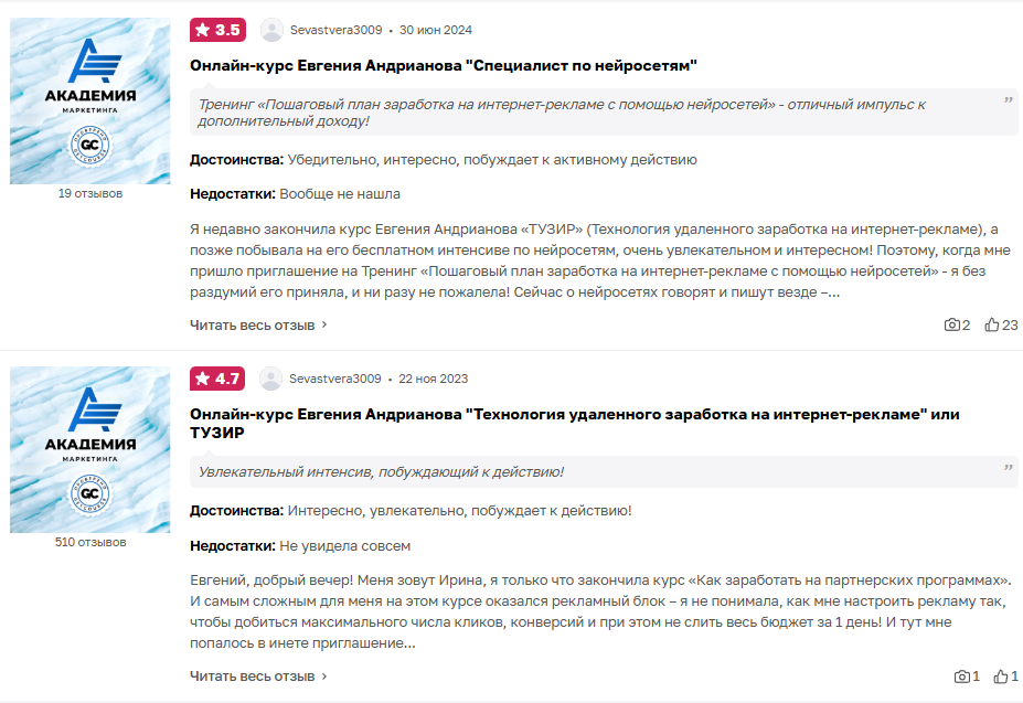 Всего 510 отзывов, большинство — 5 звезд, минимум 4 звезды, и 5% негатива. Кажется, что обучение идеально, но это не так. Реальные отзывы об академии интернет-маркетинга Евгения Андрианова негативные.