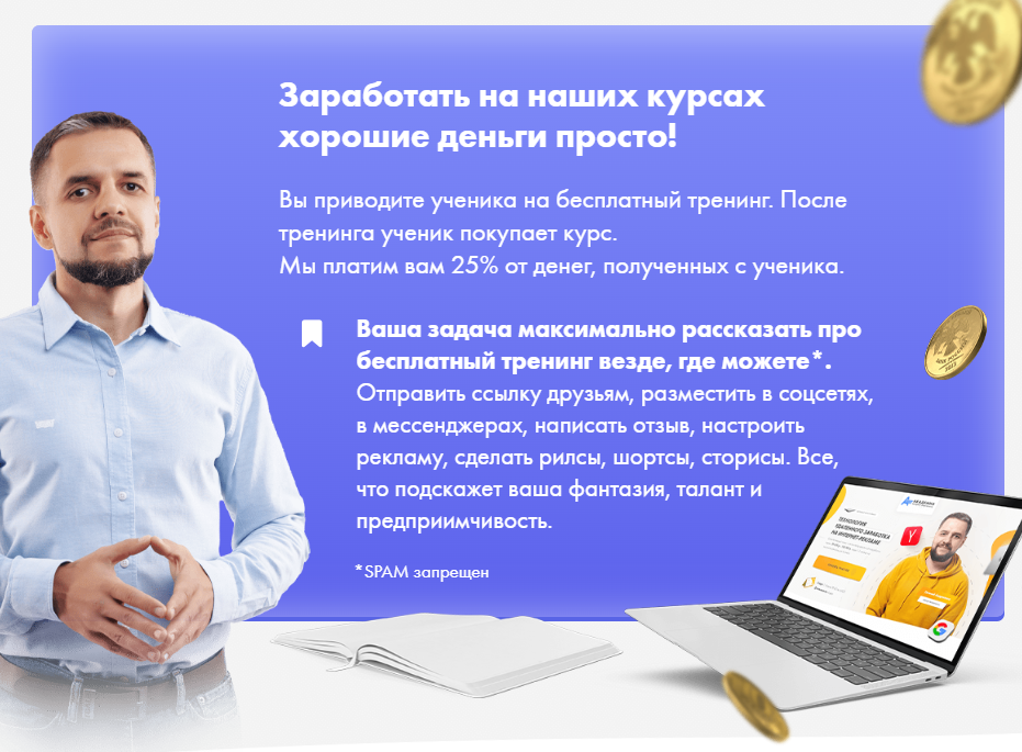 Единственное, что стоит упомянуть — партнерскую программу Евгения Андрианова. Онлайн-школа платит до 25% от стоимости каждого привлеченного ученика. При этом, никаких ограничений на рекламу нет.