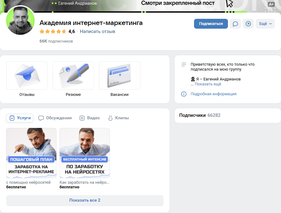 Специалист по интернет-рекламе должен уметь качать социальные сети. Иначе он профнепригоден. Но у Евгения и тут проблемы. 66 000 закрытых подписчиков, 1 000 просмотров под закрепленным постом и отсутсвующие продажи ВК. Академия интернет-маркетинга не привлекает трафик.