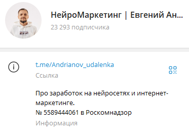 В 2025 году Евгений Андрианов позиционирует себя специалистом по заработку на нейросетях. Платное обучение стоит от 30 до 50 тысяч рублей. Курс — до 2 месяцев. За время обучения, Евгений вводит в профессию и рассказывает, основные моменты и бросает в свободное плавание. Никаких гарантий.