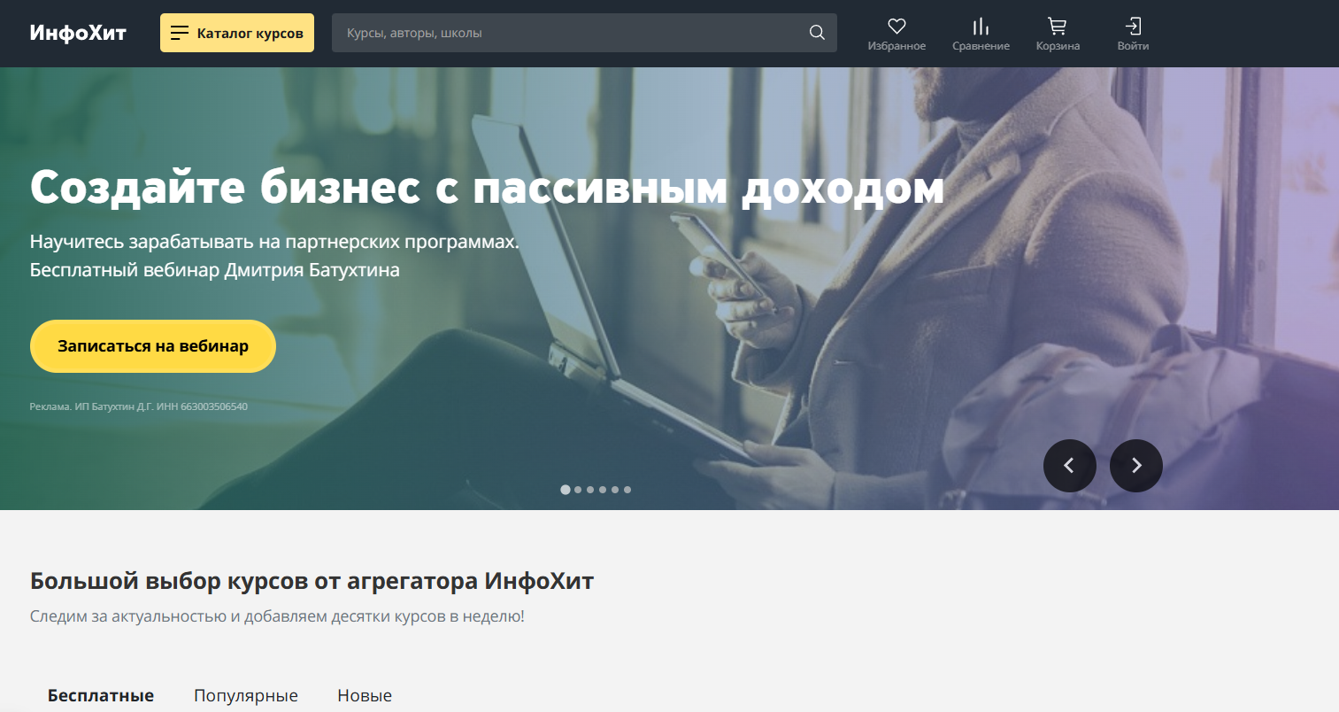 Есть один интересный факт о Евгении Андрианове, который не учитывают во многих разоблачениях. Основной сайт для продвижения — info hit ru. Это агрегатор онлайн-курсов. Евгений купил его еще в 2020 году, чтобы было легче продвигать свои учебные материалы. Он почти всегда в ТОПе.
