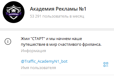 Бот Академия Рекламы создан экспертом по арбитражу трафика. Это проект для продажи обучающих курсов. Пользователям рассказывают схемы стандартного заработка: какое ПО использовать, какие связки работают и что сейчас популярно.