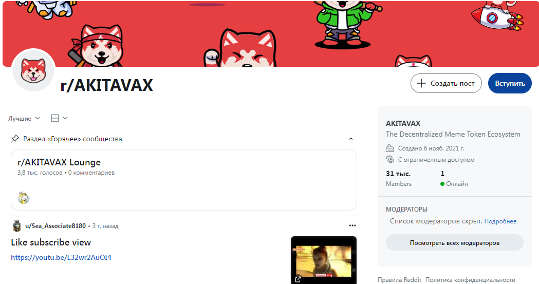 Reddit-сообщество r/AKITAVAX создано в ноябре 2021 года. При 31 тыс. подписчиков контент практически отсутствует. Последние посты датированы тремя годами назад, что указывает на заброшенность площадки.
