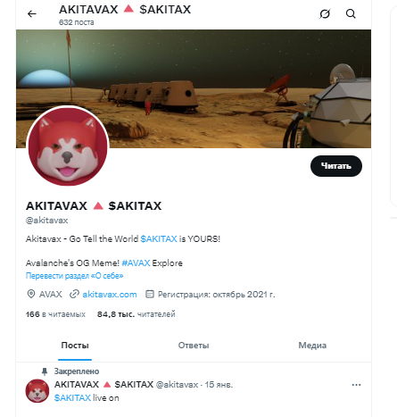 Twitter-аккаунт @akitavax существует с октября 2021 года, но публикации редкие. Профиль имеет 84,8 тыс. читателей, однако реальная вовлеченность низкая. Последние посты посвящены листингам на DEX.