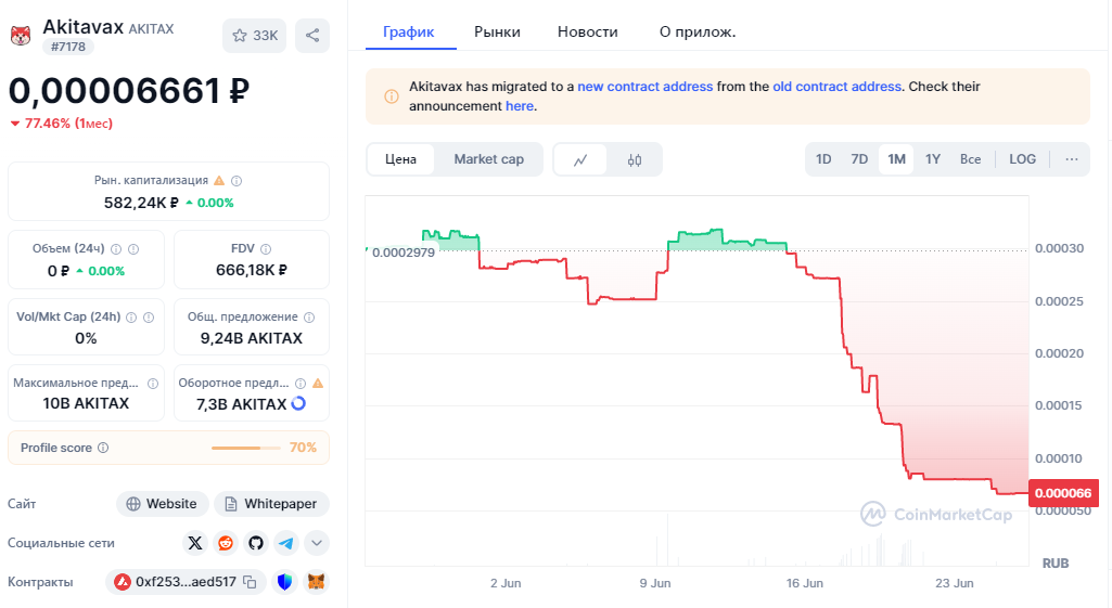 Проект недавно провел миграцию контракта, что обычно указывает на технические проблемы. Официальный сайт и white paper содержат минимальную информацию. Основные данные поступают из Telegram-чатов. График цены показывает высокую волатильность. В июне курс колебался между 0,00005 и 0,00030 ₽. Такие резкие скачки характерны для низколиквидных активов.