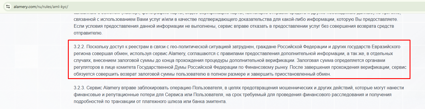 Также мы изучили раздел «Правила» и нашли в нем сомнительную запись. В пункте 3.2.2 говорят, что площадка вправе потребовать от клиентов из России внести обеспечительный залог. При этом ссылаются на постановление Комитета Государственной Думы по финансовым рынкам. На деле это уловка аферистов, которую часто используют на скам-площадках. Такого регулирующего документа не существует.Как организаторы криптообменника Alamery обманывают людей