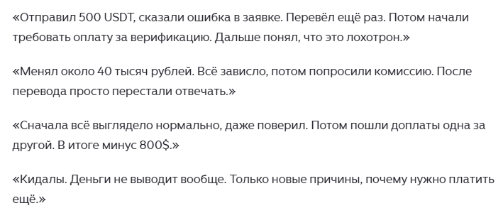 Мы хорошо знакомы с мошеннической схемой создателей таких площадок. Пользователь переводит им деньги, но обмена на самом деле не происходит. Выясняется, что заявку приостановили. На связь выходит менеджер и сообщает, что нужно внести обеспечительный залог в размере 5–10% от суммы. При этом он ссылается на «постановление комитета Госдумы по финансовым рынкам». Клиент делает новый перевод, но средства так и не приходят в ответ.