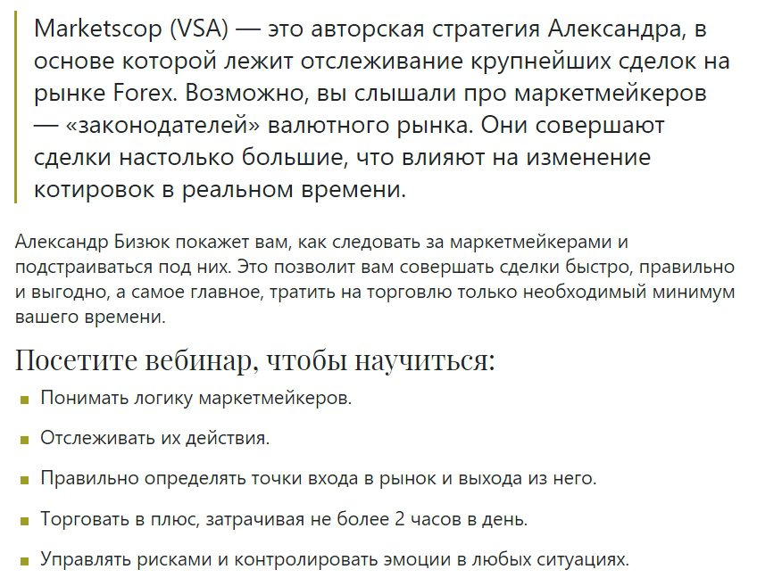 Предлагаемая трейдером Александром Бизюком обучающая программа нацелена на увеличение прибыли от торгов. По имеющимся в интернете сведениям, стратегия MarketscopVSA показывает довольно неплохие результаты. По словам автора проекта, все прошедшие бесплатный вебинар узнают: