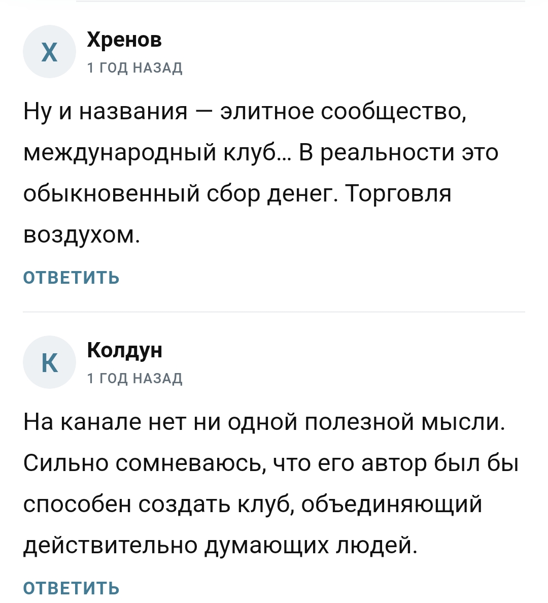 При внимательном анализе отзывов об инвестициях с Александром Чередниченко картина складывается совсем не радужная. Клиенты рассказывают, что после покупки доступа к закрытому клубу они не видят обещанных результатов. Положительные комментарии мелькают только в официальном канале, где они тщательно отбираются администратором.
