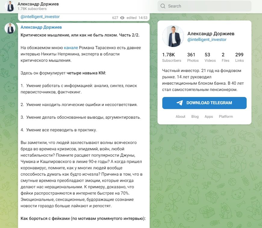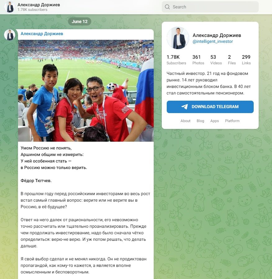 Основной канал Александра Доржиева в Телеграме имеет около 1 000 читателей, но большая часть его постов содержит размышления на разные темы, не представляя конкретных или авторских идей. Его контент полностью дублируется на Яндекс Дзене, но причина ведения двух лент на разных платформах остается неясной.