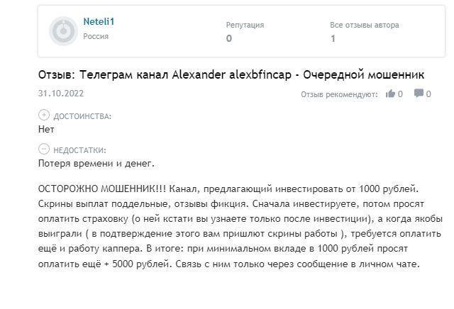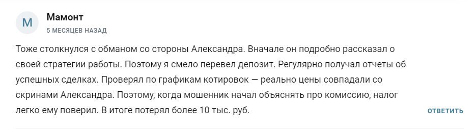 В интернете уже немало негативных отзывов о проекте ALEXBFINCAP. Клиентов разводят банальным способом, обещая быстрые и легкие деньги. На деле никаких выплат нет, а первоначальный взнос — лишь малая часть отданных мошенникам денег. После окончания торговой сессии с клиента просят процент за услуги трейдера и гаранта, а также пытаются выманить оплату налогов и комиссий биржи и банка. Суммарно потери вместо 1 тысячи рублей могут доходить до 10-15 тысяч. В довесок пользователь получает бан в сообществе и удаление всей переписки, чтобы не оставлять доказательств мошенничества.