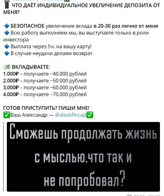Чтобы попасть на торговую сессию, нужно написать в личные сообщения ALEXBFINCAP. Клиенту предоставят реквизиты для оплаты, карта будет оформлена на третье лицо. В канале частая смена названий, ссылок и даже имени автора.