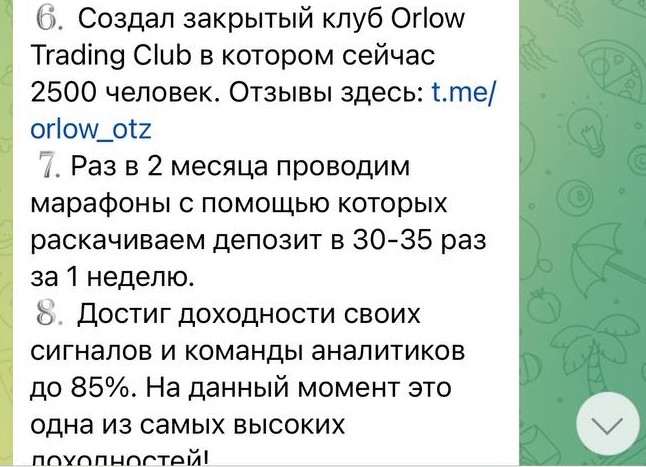 В своих постах в Телеграме трейдер Орловский заявляет о заоблачных прибылях, но ничего не может подтвердить. Отчеты постит в виде обычных текстовых постов, в которых можно указывать любые цифры. Без подтверждений поверить в его истории о 3500% прибыли в неделю невозможно.