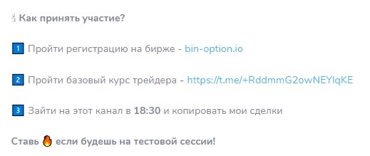 Ни в Телеграме, ни в ВК инвестора Александра нет платных услуг. В закрытый клуб добавляет за регистрацию по его партнерской ссылке у брокера Binarium и прохождение его бесплатного обучающего курса. Подписчикам в клубе якобы будет давать сигналы, способные раскачать депозит в 30-35 раз за неделю. Судя по отзывам, инвестор Александр врет и не показывать подобную прибыль. Для начала сотрудничества нужно отправить сообщение через бота Проводник Орловский Инвестор.