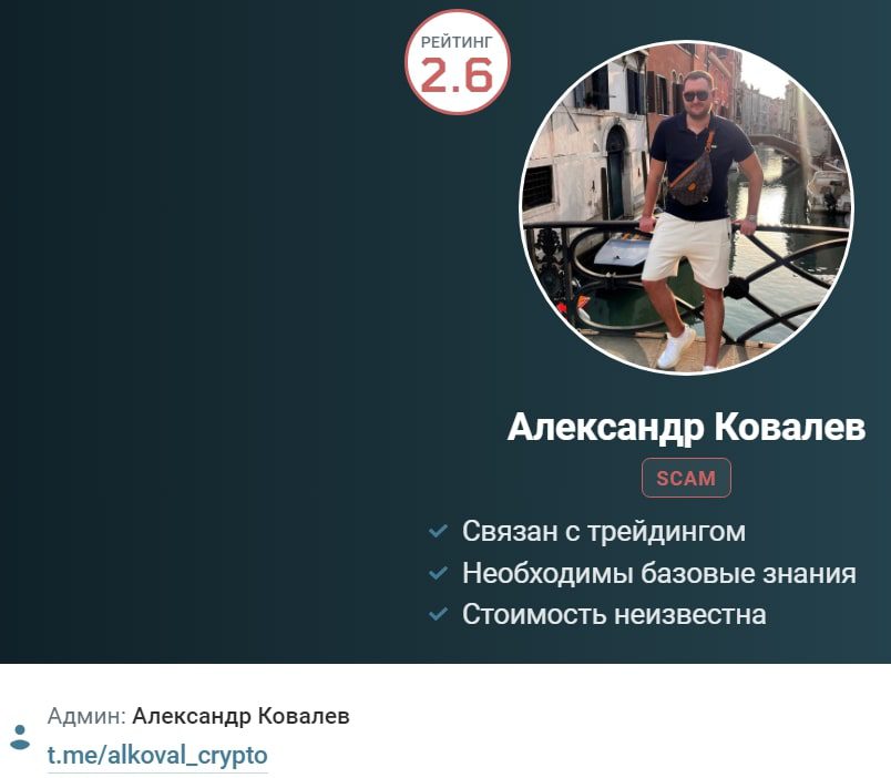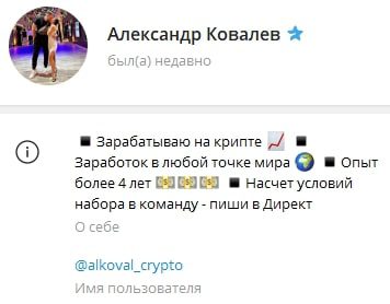 Александр Ковалев (@Alkoval_Crypto) — создатель аккаунта в телеграмм, представляющийся опытным аналитиком и трейдером с 4-летним опытом работы на криптовалютных биржах. Он предлагает каждому желающему присоединиться к его команде, чтобы научиться проводить прибыльные сделки и получать отличный доход за счет торговли цифровыми активами.