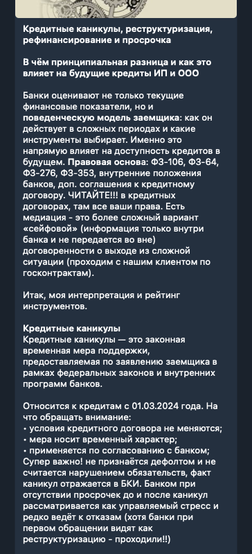 Информационный контент на ТГК — это преимущественно юридически значимая информация на тему кредитования. Также организатор проекта дает рекомендации по управлению финансами.