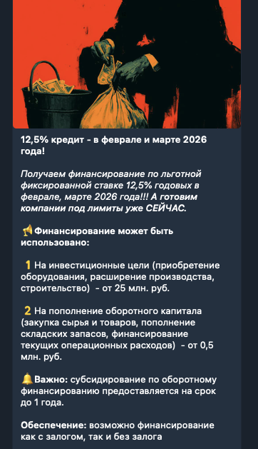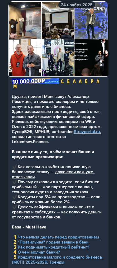 Лекомцев Александр — человек, который в Телеграмме предлагает кредитование на выгодных условиях. На февраль 2026-го года он обещает клиентам привлечь в их бизнес 5-500 миллионов рублей под 12,5%.
