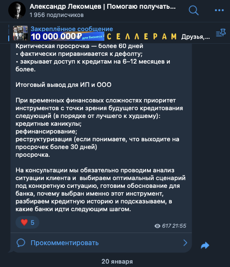 На телеграмм-канал «Александр Лекомцев Помогаю получать деньги для бизнеса», располагающийся по адресу lekomtsev off, на 4 февраля 2026-го года, подписаны 1,96 тысяч пользователей. Публикации в его ленте получают в среднем по 500-650 показов и 3-7 реакций. Комментарии под постами открыты, но в них почти никогда не возникают обсуждения.