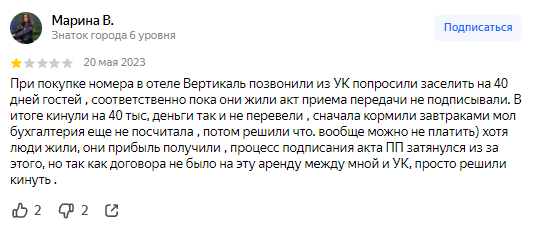 Компания берет объекты в управление, чтобы приносить прибыль клиентам и забирать часть денег себе. В итоге, организация почти полностью забивает на потребности клиентов.