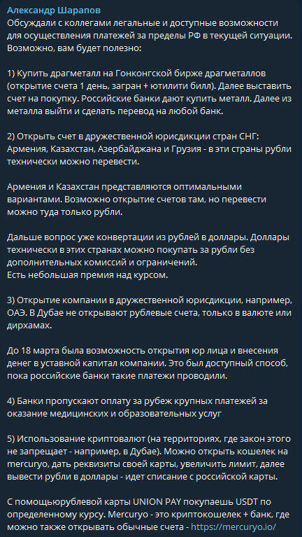 Контент в Telegram-канале Александра странный. Иногда он пишет реально интересные вещи. Например, как перевести деньги за границу, в условиях санкций.Буквально в том же посте реклама сомнительного сервиса, который принимает криптовалютные платежи на банковские аккаунты. И так во всем. Весь контент строится на экспертности, но временами проскакивают такие поступки, которые сложно объяснить.
