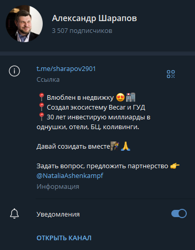 Александр Шарапов завел свой Телеграм канал @sharapov2901. В нем он рассказывает про объекты недвижимости и дает советы по покупке объектов. На момент написания статьи на канале 3 500 подписчиков.