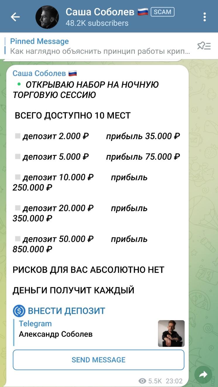 Канал в Телеграмме был основан в сентябре 2022 года Александром Соболевым, якобы успешным трейдером с опытом торговли на криптобиржах. Сейчас аудитория состоит из 48.2k подписчиков, из которых только 2-5k просматривают публикации и проявляют актив. По сравнению с подписчиками, это малый показатель, который и указывает на явную накрутку. Админ инвесторам предлагает: