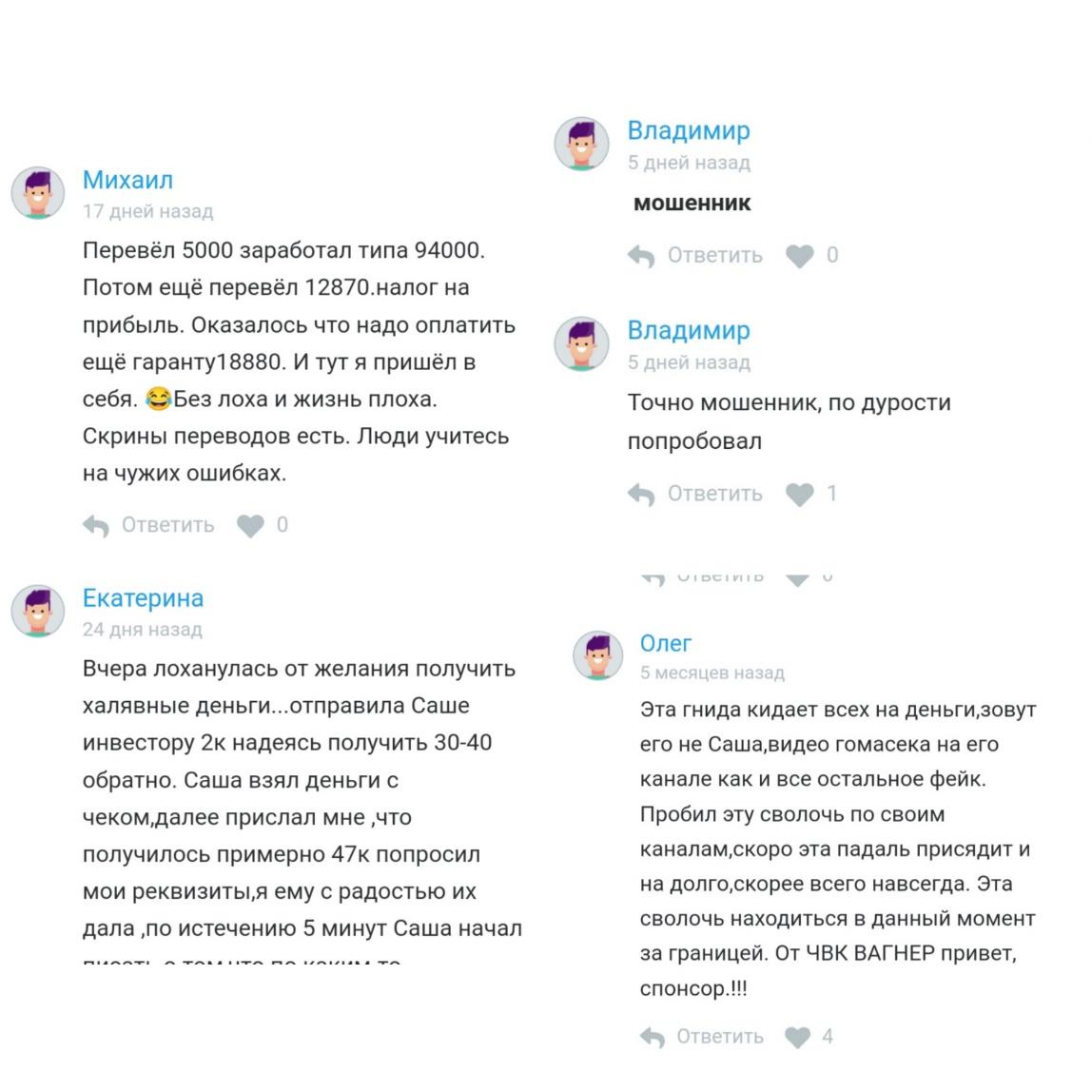 Александр утверждает, что он занимается трейдингом 7 лет и может гарантировать прибыль за несколько часов. На самом деле это мошенник, который разводит инвесторов на деньги. Отзывы про Сашу Соболева только негативные, и сейчас на канал регулярно поступают жалобы. Мы выявили следующие минусы: