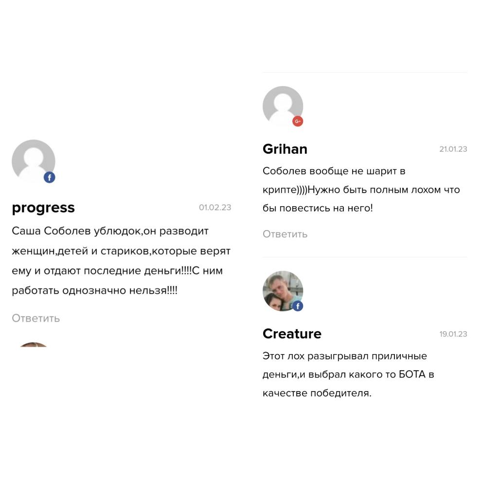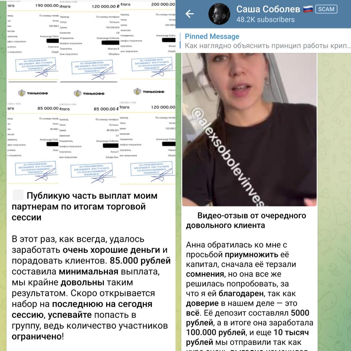 На самом канале имеются фейковые видео с отзывами от заказных людей. Там рассказывают, что сотрудничество смогло принести большую прибыль. В реальности клиенты недовольны работой с проектом, ведь он разводит пользователей на деньги. В интернете сейчас появляются новые негативные отзывы, и можно уверенно заявить о том, что каналом руководит аферист. В Телеграмме сам Александр Соболев называет себя миллиардером из Москвы и успешным трейдером, хотя никаких доказательств этому нет. Он обманным путем забирает все вложения инвесторов себе и взимает дополнительную комиссию. Доверять проекту однозначно нельзя.