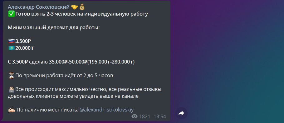 Alexandr Sokolovskiy указывает, что он может взять 2-3 человека на индивидуальную консультацию и инвестирование с минимальным депозитом 3500 рублей. Он обещает получение дохода от 35000 рублей до 50000 рублей, что по времени у него занимает 2-5 часов. Инвестор считает себя успешным трейдером и утверждает, что ему можно доверять.
