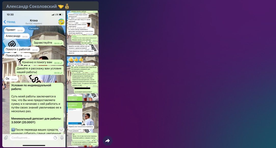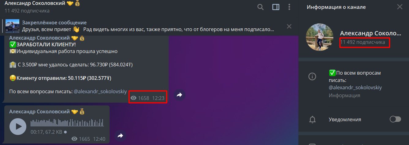 В Телеграм Александра Соколовского 11 492 подписчика, которые вкладывают средства в надежде получения прибыли в разы превышающей вклад. Он не объясняет алгоритм увеличения депозита и публикует успешные результаты сотрудничества. В ленте также оставляет голосовые сообщения, в которых обещает реальные выплаты. Таким образом псевдо эксперт устанавливает доверительные отношения с потенциальными инвесторами.