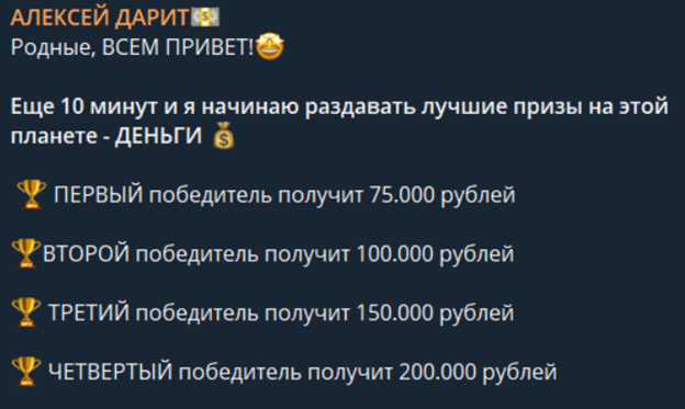 Алексей Геннадьевич активно вел телеграмм-канал. Его аудитория превышала 20 тыс. подписчиков, но количество просмотров на постах в среднем составляло 500-1000 штук. Это свидетельствует о том, что автор пользовался накруткой.Анализ контента на канале позволяет предположить, что создателем проекта является мошенник. Гипотетически блогер мог называть победителем каждого человека, а потом просить перевести ему налог, который бы позволил обойти какие-нибудь лимиты. Однако не факт, что блогер «Алексей Дарит» в Телеграм работал именно по такой схеме. Удаление канала намекает на то, что с проектом явно не все было в порядке.