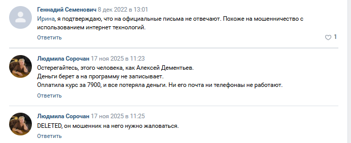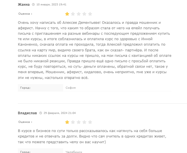 На независимых площадках отзывы в большинстве негативные. Пользователи утверждают что Алексей Дементьев мошенник и инфоцыган, его сайт и соцсети — развод. С их слов, контент курсов очень поверхностный, автор повторяет общеизвестную информацию. Обещанных прямых эфиров нет, все занятия подаются в записи. С возвратом средств очень большие сложности. Хотя формально и по договору оферты пользователи могут вернуть стоимость обучения, на практике это практически невозможно.