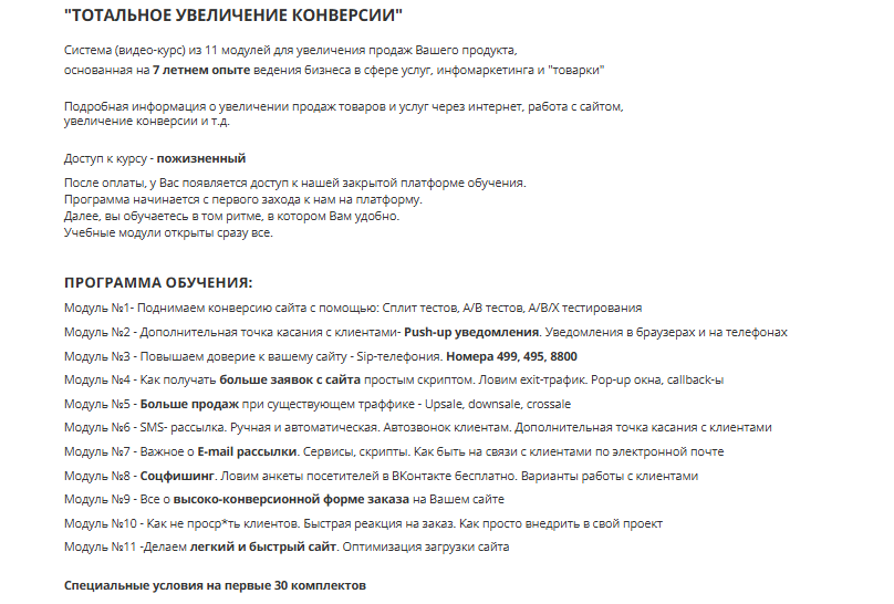 Видеокурс из 11 модулей, посвящённый увеличению продаж товаров и услуг. Темы включают: