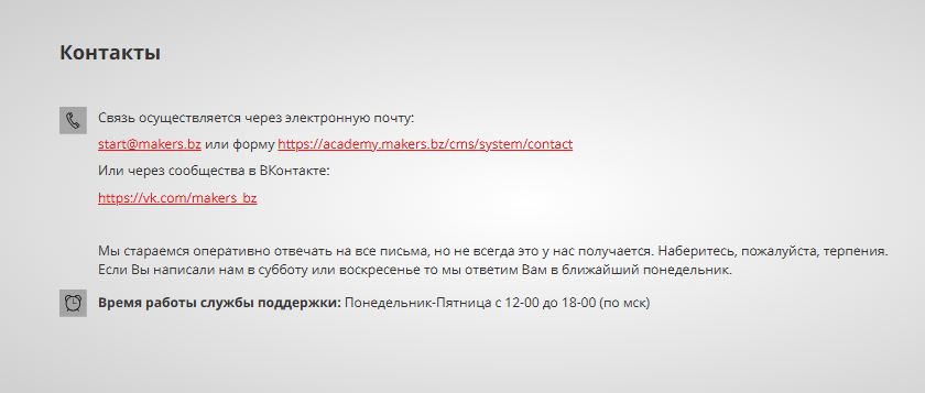 Служба поддержки: start@makers bz, время работы ПН–ПТ, 11:00–18:00 по МСК.
