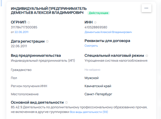 Дементьев работает легально, он зарегистрирован как ИП с основным видом деятельности образование и консультации. Обучающие программы ведутся в нескольких направлениях торговля, рекламное продвижение и медицина (похудение, нутрициология, биохакинг, гормоны). Сертификаты или дипломы, которые могут подтвердить, что блоггер Алексей Дементьев врач, отсутствуют, в его биографии нет даже упоминаний о профильном вузе.