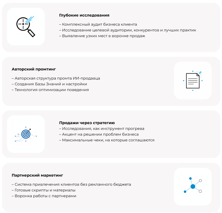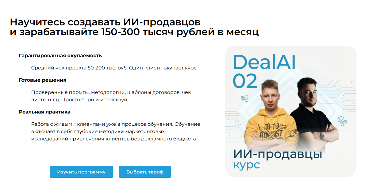 Основной курс посвящен созданию ИИ-продавцов, на которых можно зарабатывать до 300 тысяч рублей в месяц. Во время обучения студентам обещают работу с настоящими клиентами.