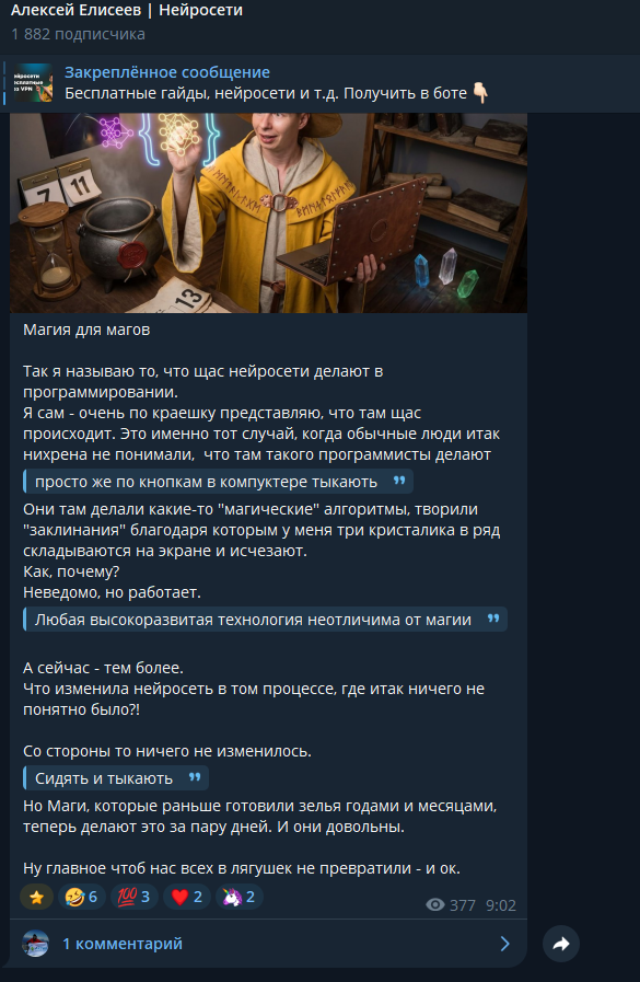 Однако основная проблема не в числе фолловеров, а в их активности, поскольку на постах тяжело увидеть даже 400-500 просмотров. Контент же сложно назвать полезным: в большинстве публикаций автор рассказывает о том, насколько нейросети перспективны. Это, очевидно, нужно, чтобы убедить пользователей в ценности его курса.